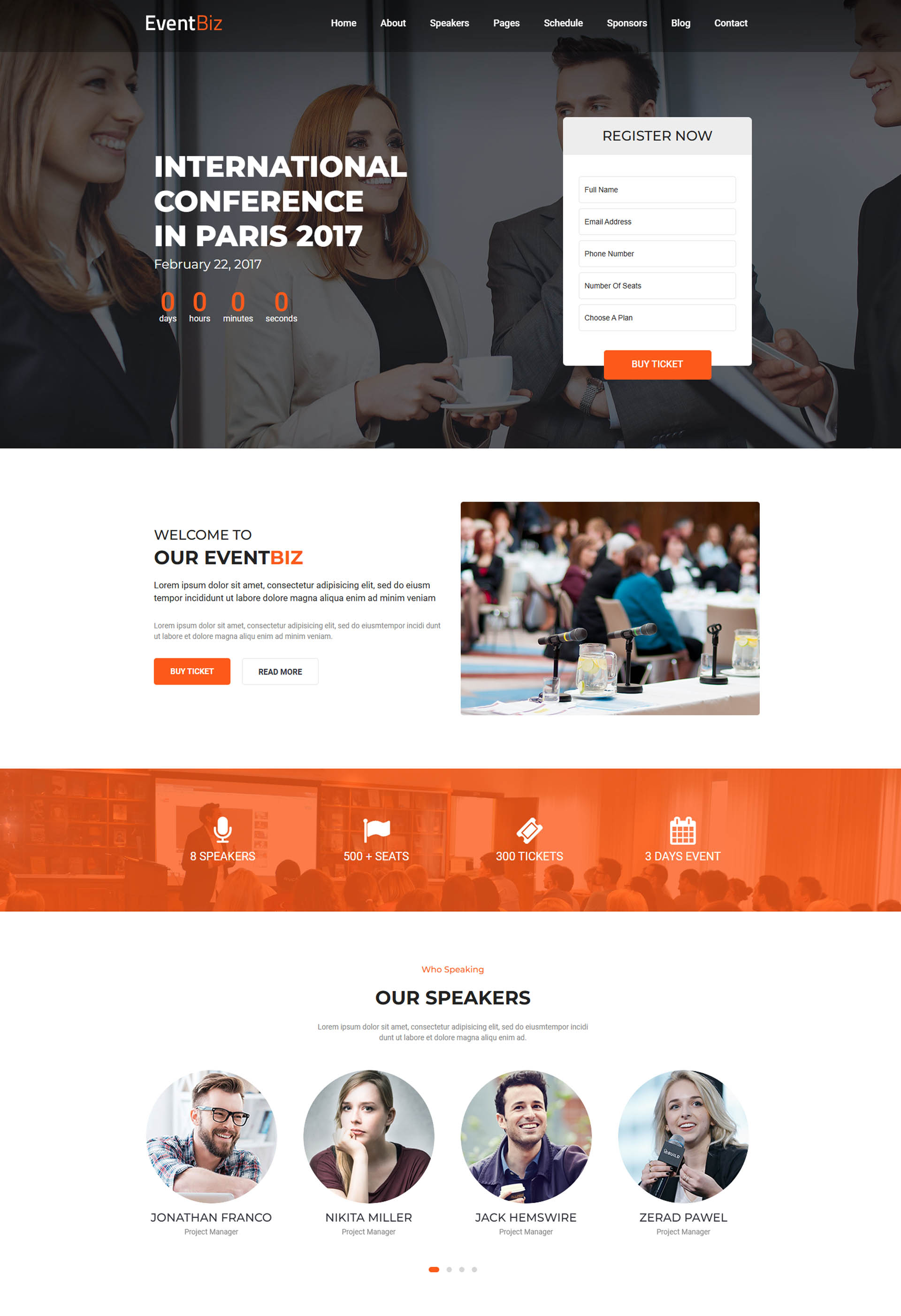 قالب مثالي للمؤتمرات والفعاليات الكبيرة. يتميز بأقسام متعددة مثل جدول الأعمال، المتحدثين، والتسجيل. مناسب للشركات والمؤتمرات.