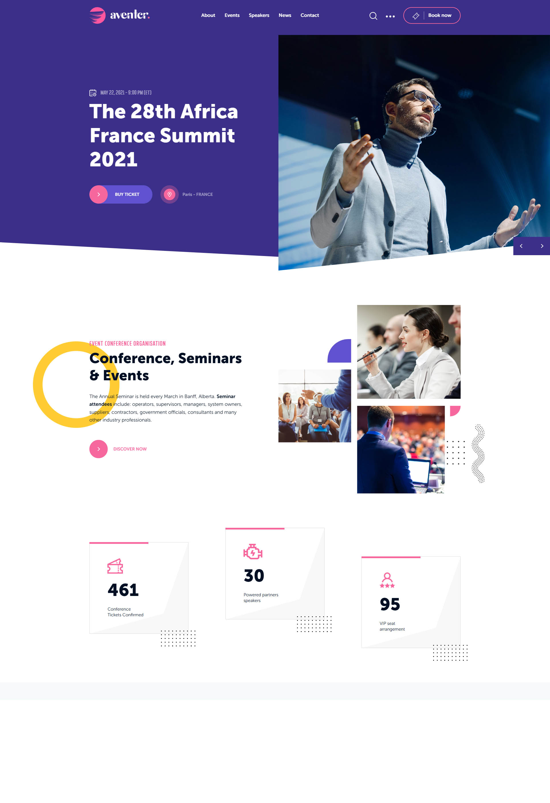 قالب مثالي للمؤتمرات والفعاليات الكبيرة. يتميز بأقسام متعددة مثل جدول الأعمال، المتحدثين، والتسجيل. مناسب للشركات والمؤتمرات.